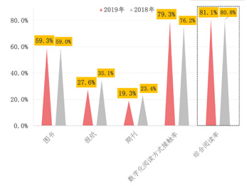 4月20日,中國新聞出版研究院在線發布“第十七次全國國民閱讀調查”。調查發現,2019年我國成年國民包括書報刊和數字出版物在內的各種媒介的綜合閱讀率為81.1%,較2018年的80.8%提升了0.3個百分點。其中,數字化閱讀方式(網絡在線閱讀、手機閱讀、電子閱讀器閱讀、Pad閱讀等)的接觸率為79.3%,較2018年的76.2%上升了3.1個百分點。