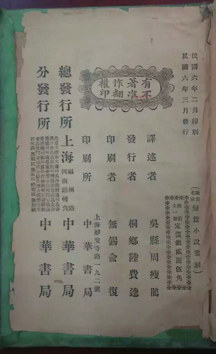 周瘦鵑所說“先出”的平裝初版本,筆者多方搜找,均未發現附有完整版權頁的實物,但從兩處研究資料里找到封面書影。范伯群主編《周瘦鵑文集3》附有封面圖片,圖下加說明文字“1917年2月出版的《歐美名家短篇小說叢刊》書影” ?。另一個是張澤賢《中國現代文學翻譯版本聞見錄 1905-1933》所附的上冊插圖?,正文敘述:“《歐美名家短篇小說叢刊》,‘懷蘭室叢書’之一,周瘦鵑譯,中華書局1917年3月出版?!??