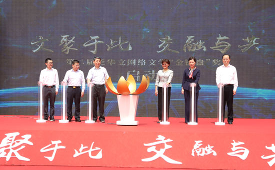 徐寧副部長與汪興國、盛蕾、李貞強、張思明、匡暉共同上臺啟動第二屆泛華文網絡文學“金鍵盤”獎。本屆評獎作品的范圍為在全國各大文學網站發表,并于2018年1月至2019年12月期間完本或翻譯成外文且在國外網站連載或出版的華文網絡文學作品(含繁體文字作品),以及在此期間實體出版和影視、游戲、動漫改編的華文網絡文學作品。具體評獎公告將在江蘇作家網發布。