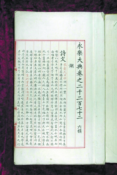 眼前這冊《永樂大典》與程有慶在國圖地庫中看到的《永樂大典》一模一樣。袁女士這冊《永樂大典》是“?!弊猪嵉摹昂弊?,內容是與“湖”字有關的部分。此前,國圖已經收藏了兩冊“湖”字單冊,在程有慶印象中,中間正好缺這一冊。不過為了保險起見,他立刻打電話給曾在中華書局工作的父親,請他幫忙查一下已發現《永樂大典》的存目。