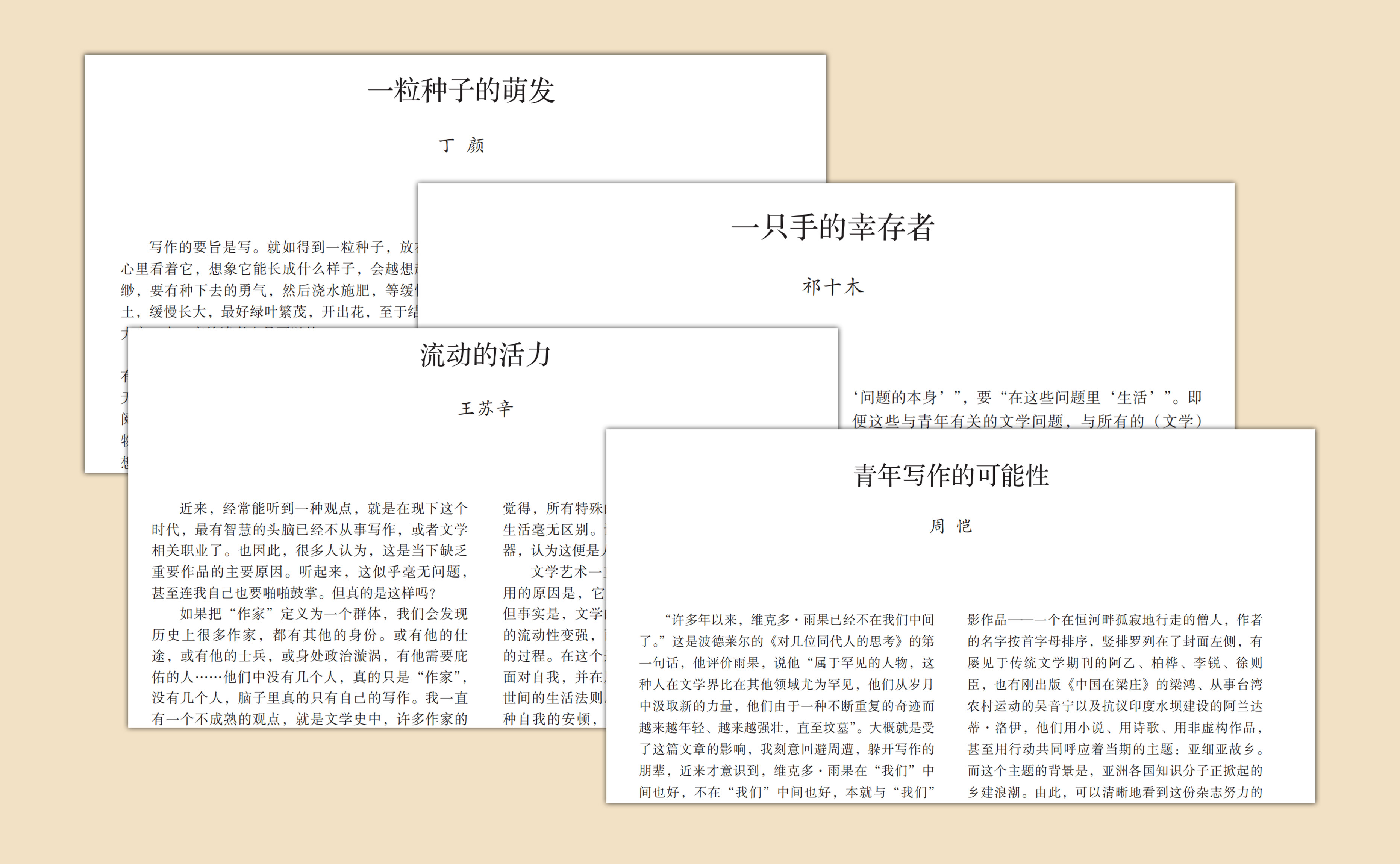丁顏在18歲時完成了一部30萬字的長篇小說,但無論投稿何處都無人接收。不過現在再回頭看這部幾年前的少作,她反而不愿意再拿出來出版了?!拔矣X得‘新時代青年寫作的可能性’對我們青年來說就是一種邊寫作邊成長的過程?!痹谖恼轮?,丁顏用形象化的比喻闡述了自己對寫作的思考:“寫作的要旨是寫。就如得到一粒種子,放在手心里看著它,想象它能長成什么樣子,會越想越縹緲,要有種下去的勇氣,然后澆水施肥,等緩慢出土,緩慢長大,最好綠葉繁茂,開出花,至于結果,大方一點,交給讀者也是可以的?!睙o盡的繁花都來源于最初的種子,不是所有的種子能夠發育成繁花朵朵。但所有的種子亦都有通向盛開的可能性。