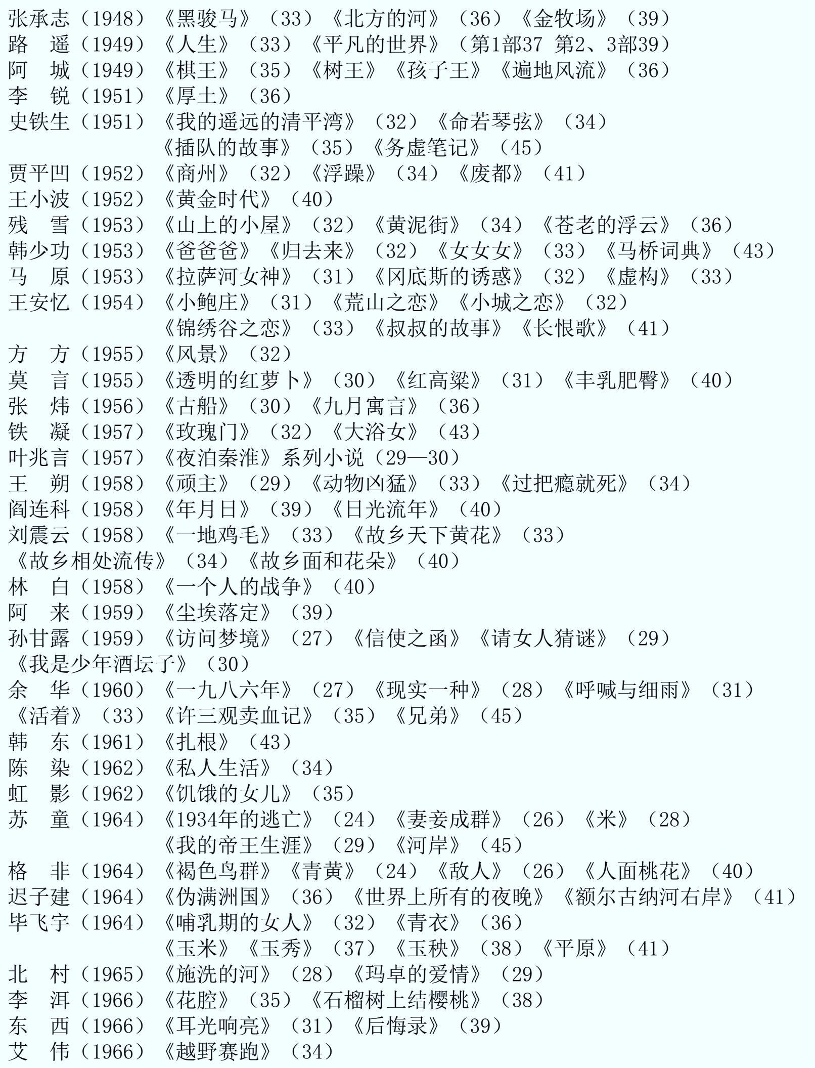 何平統計的新時期以來部分知名作家發表代表作時年齡表(注:姓名后數字為出生年份 作品后數字為該作品的首發時作者的年齡)
