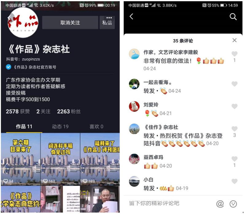 自2020年4月入駐抖音APP以來,《作品》雜志社官方號共發布作品11條,視頻內容均為介紹當期刊發作品、展現編輯工作日常、賞讀知名作家手稿,獲贊數和粉絲數均有兩千余??镓撠熑送跏掠脗€人抖音號試水,也收割了6萬獲贊,1.6萬粉絲,成為了一名小小“文學”網紅。王十月說,自己本以為抖音上的年輕人會喜歡金庸,但沒想到文學的流行面孔早已革新,新一代年輕人對武俠小說興趣有限,對網絡文學認同感更高,“你要是膽敢在抖音上說一句《雪中悍刀行》不好看,至少能有十萬的播放,不過他們不會給你點贊”。王十月發現,新一代年輕人的認知已經和“70后”的自己有著極大的差別,自己對年輕人的所思所想知之甚少,做抖音能倒逼他按照年輕人的想法思考,也能讓刊物的內容最大限度地被更多讀者熟悉。按照抖音短視頻的運行機制,要在20秒內將核心的內容提供給用戶,撰寫抖音文案時,他發現自己以前的寫作廢話太多,“要按照抖音文案的標準,一篇文章最后留下的就是精彩的東西”。