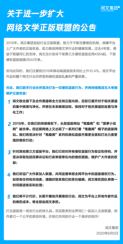 6月5日,閱文集團發布關于進一步擴大網絡文學整版聯盟的公告,展現一系列打擊盜版成果,并推五大實質舉措打擊盜版。