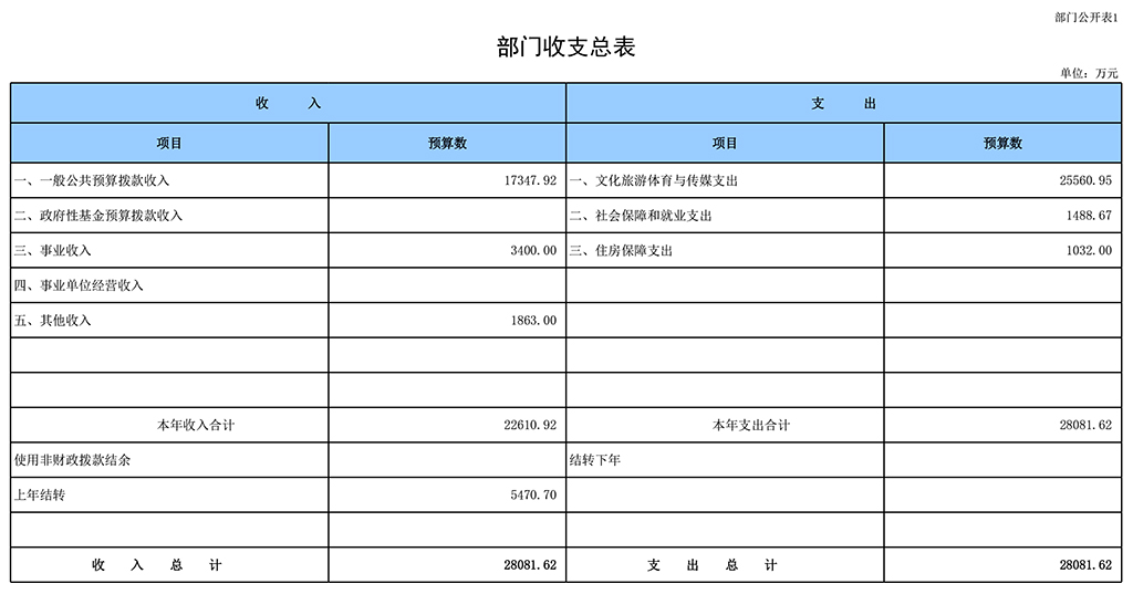文化旅游體育與傳媒支出(類)支出14897.46萬元,占比85.88%;社會保障和就業支出(類)支出1485.46萬元,占比8.56%;住房保障支出(類)支出965.00萬元,占比5.56%。