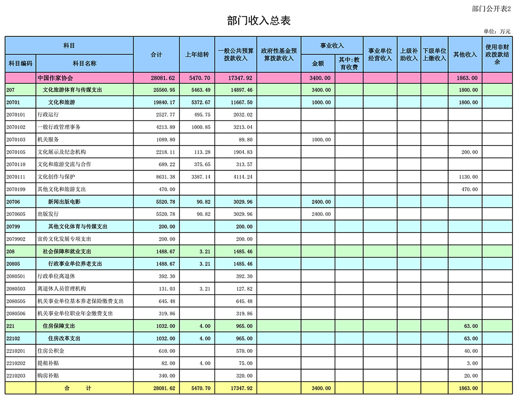 按照綜合預算的原則,中國作家協會所有收入和支出均納入部門預算管理。收入包括:一般公共預算撥款收入、事業收入、事業單位經營收入、其他收入、上年結轉。支出包括:文化旅游體育與傳媒支出、社會保障和就業支出、住房保障支出。