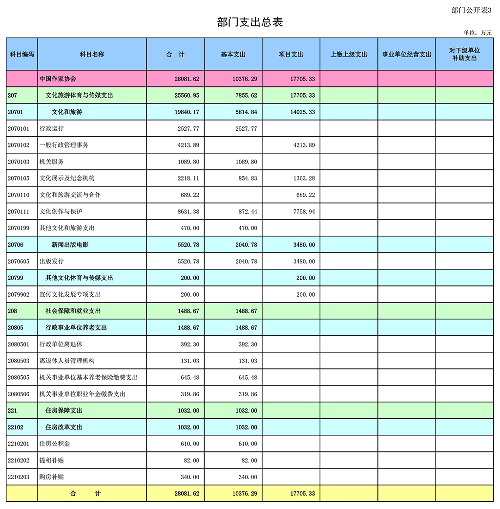 (十二)文化旅游體育與傳媒支出(類)新聞出版電影(款)出版發行(項):主要指中國作協所屬報刊社網出版傳播的項目支出。