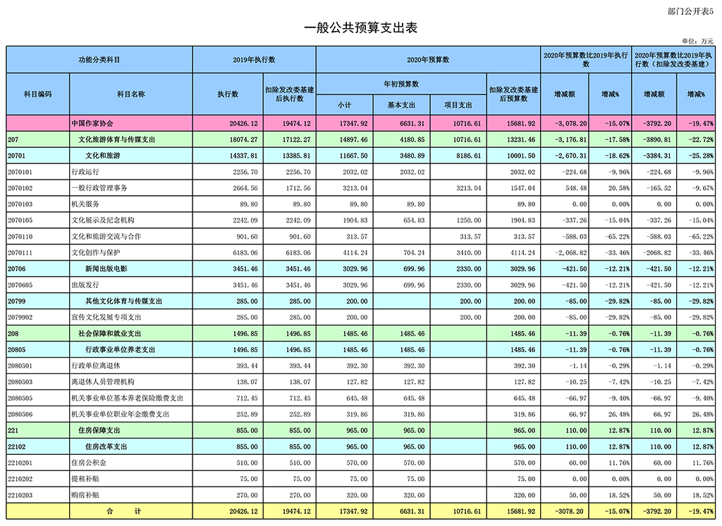 五、關于中國作家協會2020年一般公共預算支出表的說明