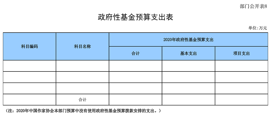 中國作家協會2020年財政撥款收支總預算22818.62萬元。收入全部為一般公共預算撥款,無政府性基金預算撥款,包括:一般公共預算當年撥款17347.92萬元,上年結轉5470.70萬元。支出包括:文化旅游體育與傳媒支出20360.95萬元,社會保障和就業支出1488.67萬元,住房保障支出969.00萬元。