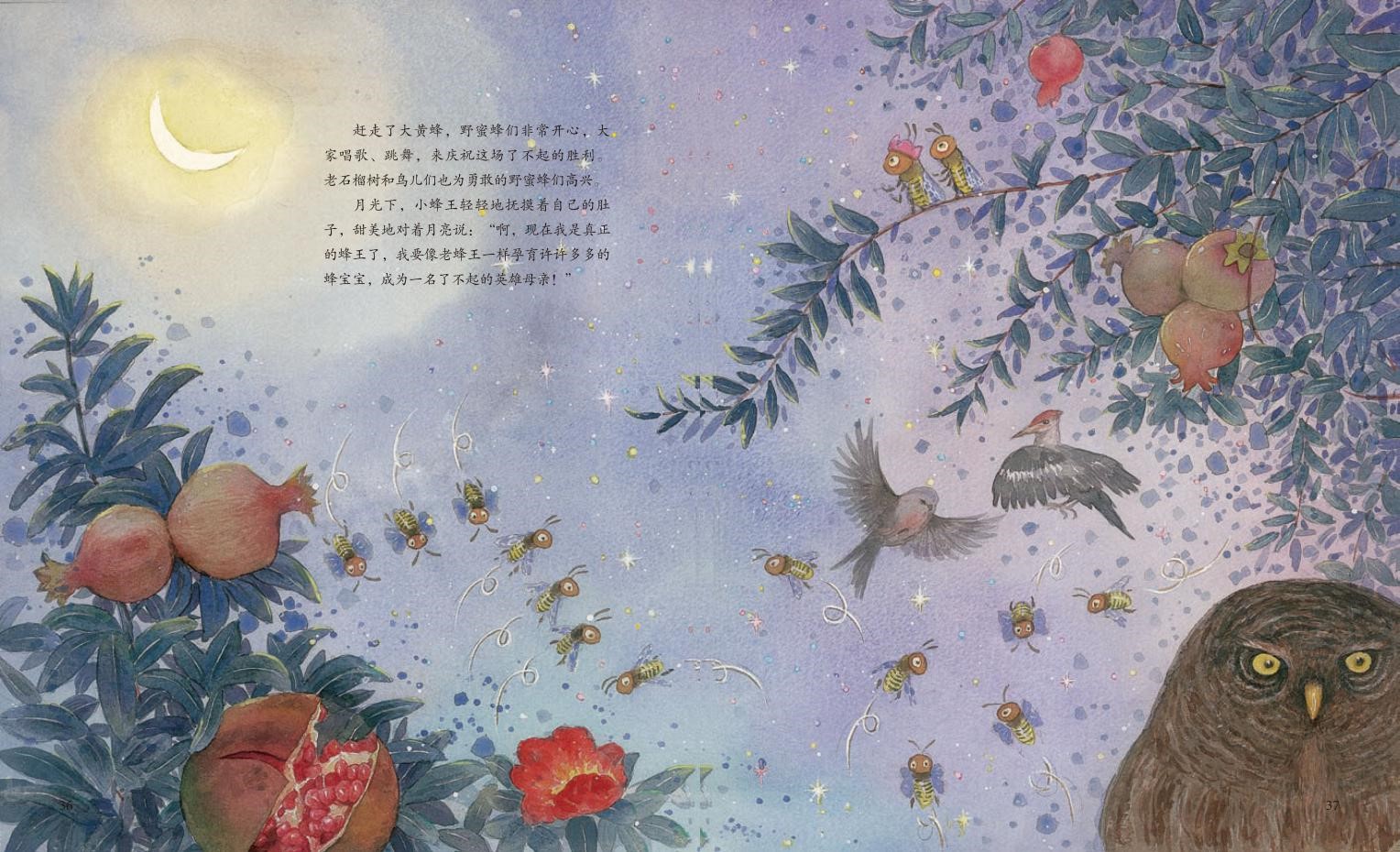果園里的老石榴樹特別希望野蜜蜂家族能搬遷到遠方的山谷去安家,繁衍后代。因為她很清楚,野蜜蜂家族變成弱群的原因。老蜂王沒有答應,她可不能在石榴樹開花最需要授粉的時候離開果園。當年輕的蜂王誕生時,野蜜蜂家族遭遇了外敵大黃蜂的襲擊。危難時刻,年輕有為的蜂王帶領蜂群加緊訓練后與大黃蜂斗智斗勇,最終打敗敵人。在老蜂王的囑托下,年輕蜂王帶領新的蜂群飛向山谷……