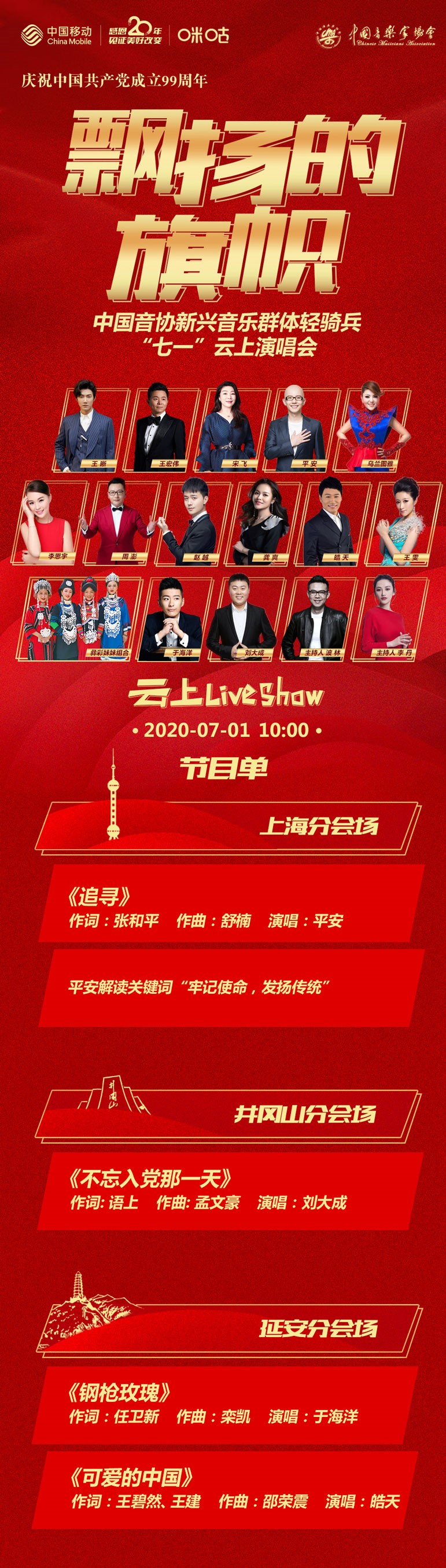 為慶祝中國共產黨成立99周年,由中國音樂家協會主辦,咪咕音樂、上海音樂家協會、陜西省音樂家協會、江西省音樂家協會、四川省音樂家協會、中國文藝網承辦的“飄揚的旗幟”——中國音協新興音樂群體輕騎兵“七一”云上演唱會在7月1日舉辦。本次演唱會聚焦初心使命,講好黨的故事,體現不同歷史時期中國共產黨人的理想信念,展現新時代全國人民為實現中華民族偉大復興中國夢不懈奮斗的精神面貌。