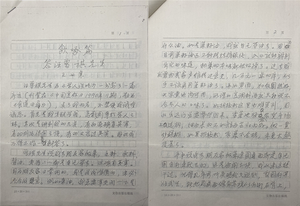 美食為兩人同好,談起美食,暢安老是謙遜而自信的,信中言道:“前兩期《中國烹飪》汪曾祺先生撰文點了襄的名,中有不甚確實之處,故不得不作一答復,茲連同尚未刊出拙作復印一并寄奉,聊博一粲?!?/p>