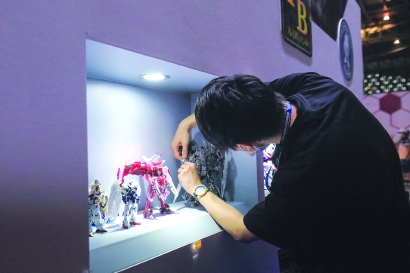第十六屆中國國際動漫游戲博覽會今開幕,工作人員正加緊布展。 本報記者 葉辰亮攝