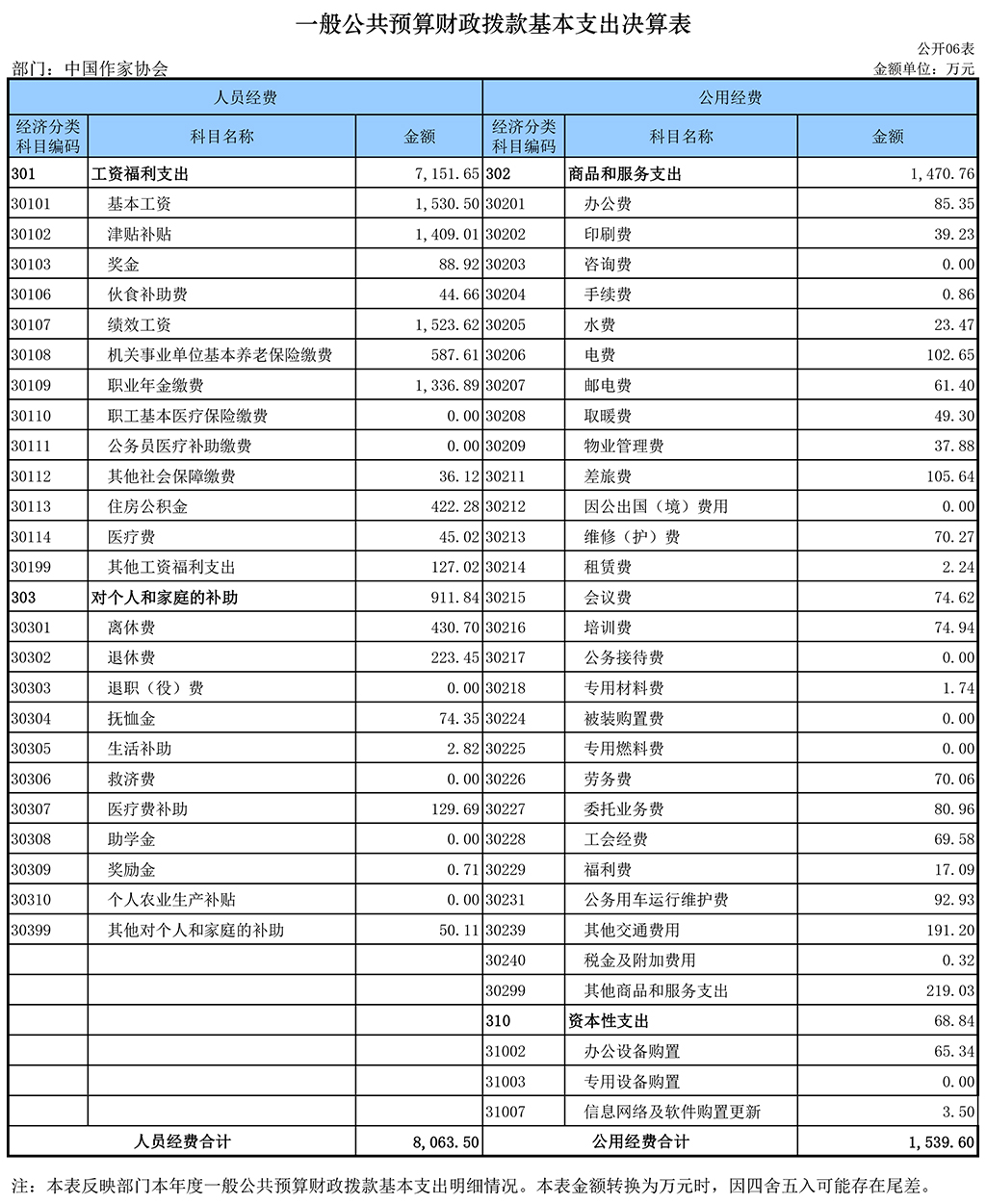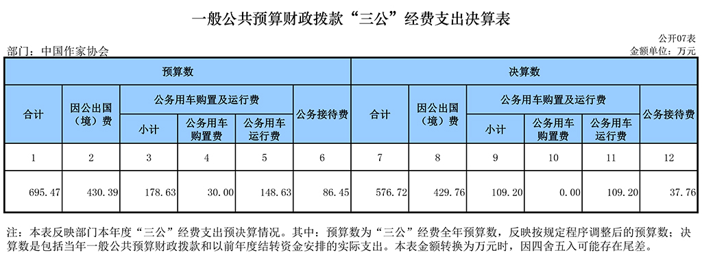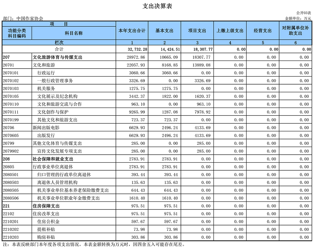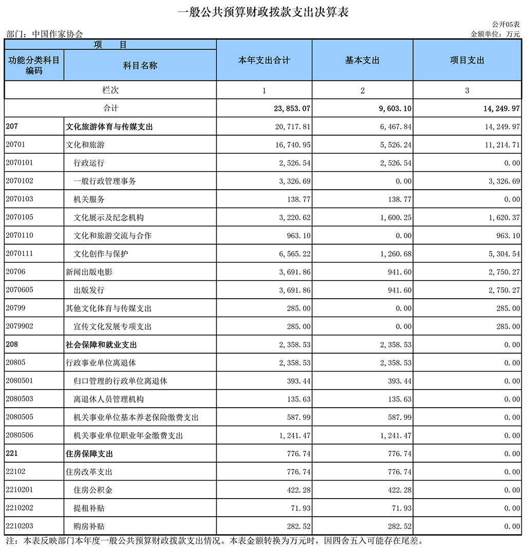 七、文化旅游體育與傳媒(類)文化和旅游(款)行政運行(項):指中國作協本級行政人員工資及機構正常運轉、履行職責所需的基本支出。