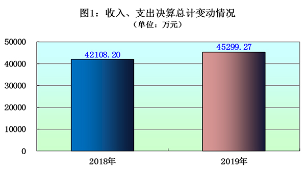 2019年度收、支總計45299.27萬元。與2018年相比,收、支總計各增加3191.07萬元,同比增長7.58%。