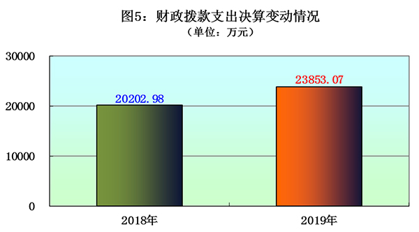 2019年度財政撥款支出23853.07萬元, 占本年支出合計的80.18%。與2018年相比,財政撥款支出增加3650.09萬元,增幅18.07%,主要是文化旅游體育與傳媒支出中的一般行政管理事務和社會保障和就業支出中的機關事業單位職業年金繳費支出增加。