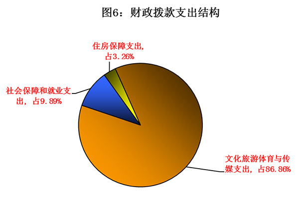 2019年度財政撥款支出23853.08萬元,主要用于以下方面:文化旅游體育與傳媒(類)支出20717.81萬元,占86.86%;社會保障和就業(類)支出2358.53萬元,占9.89%;住房保障(類)支出776.74萬元,占3.26%。