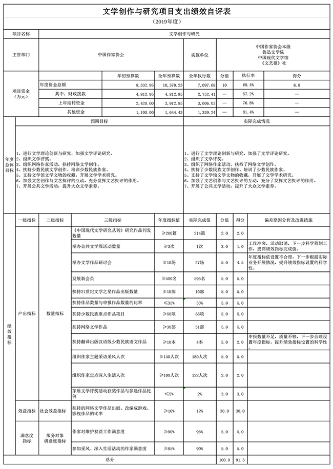 我會2019年在中央部門決算中反映“文學創作與研究”和“文學出版與傳播”兩個一級項目績效評價結果。