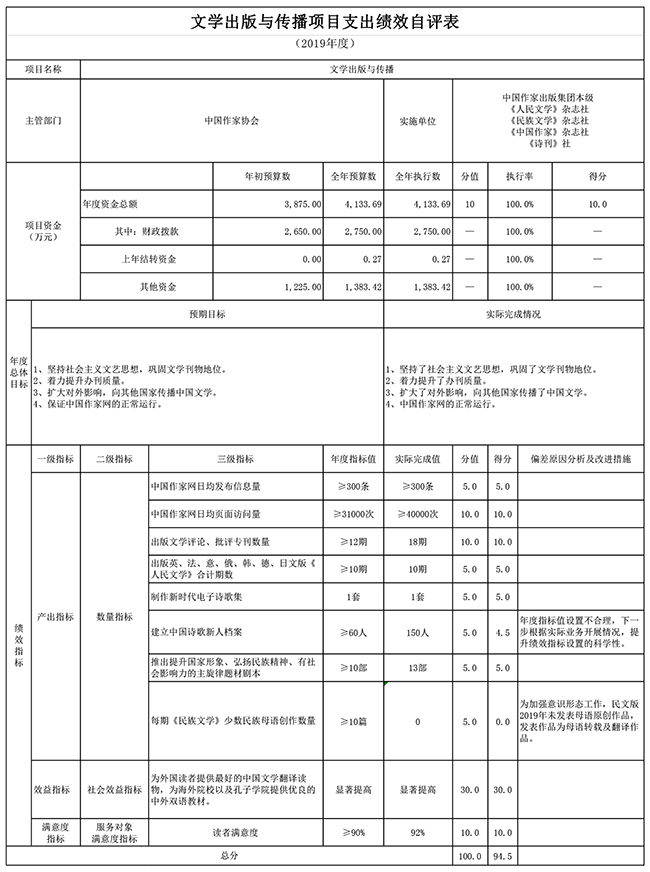 2.“文學出版與傳播項目”績效自評綜述:根據年初設定的績效目標,項目自評得分為94.5分。項目全年預算數4133.69萬元,執行數為4133.69萬元,完成預算的100.0%。項目績效目標完成情況:堅持了社會主義文藝思想;鞏固了主要文學刊物的主導地位,著力提升了辦刊質量;擴大了中國文學的對外影響,向其他國家傳播了中國文學;中國作家網正常運行。發現的問題及原因:一是部分績效指標設置不合理,不利于績效評價和實際工作的開展,預算執行過程中完成難度較大;二是文學刊物的質量需要進一步提高。下一步改進措施:增強對于績效指標科學性的設置,根據項目目標要求和實際工作開展情況,設置合理的績效指標,著力提升文學刊物的創新性。