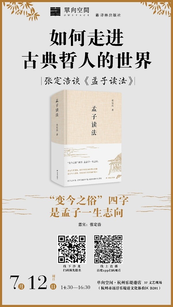 7月12日,張定浩帶著他的新書來到杭州,做客單向空間·杭州樂堤港店,與讀者分享自己對《孟子》及孟子其人的認識。張定浩說,《孟子讀法》出版后一直未在上海做活動,此次特地在杭州舉辦第一場分享活動再次說明了他與杭州的緣分,早在《孟子讀法》之前,張定浩已經寫過一本叫“孟子選讀”的小書,這本書正是由杭州出版社出版的。