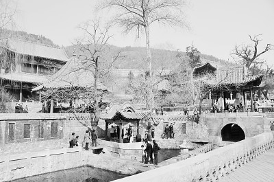 獻殿西為魚沼飛梁,方形水池,上建十字形橋梁——“魚沼”即魚池,“飛”是跨越的意思,“梁”是橋的古稱?!端涀ⅰ分性峒氨蔽簳r期這里就建有一座“魚沼飛梁”,現存者修建于北宋時期,是全國唯一的孤例,以石質的八棱柱和木質的斗栱來承托東西橫平、南北斜升的橋身。