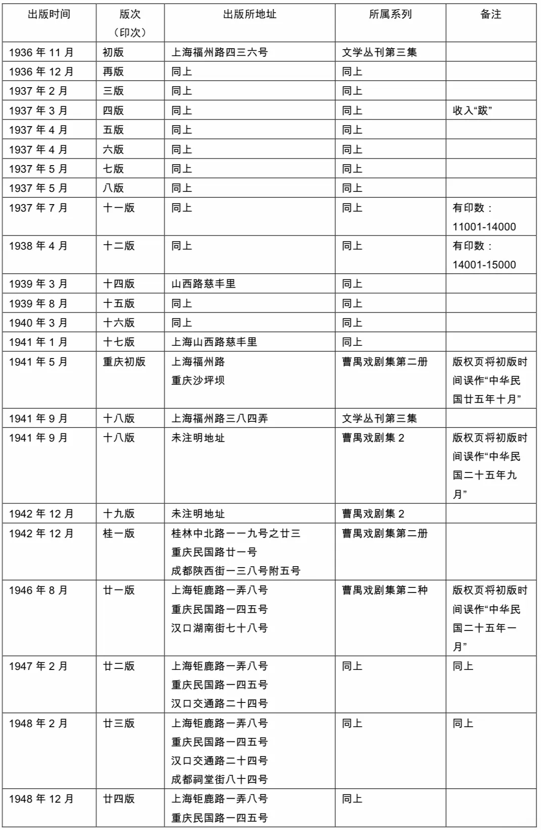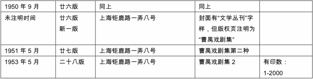 接下來出版的《日出》“曹禺戲劇集”放棄了自己的獨立版次,使用與《日出》“文學叢刊”統一的印次,1941年9月“曹禺戲劇集”第18版和“文學叢刊”系列第18版同時出版。此后,《日出》“文學叢刊”系列不復得見,而“曹禺戲劇集”則繼續沿用“文學叢刊”系列的版次繼續出版。