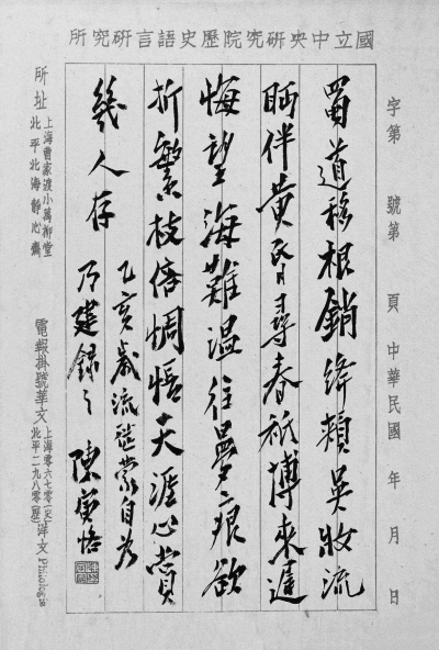 1948年12月,平津戰役激烈進行,清華園內人心惶惶。南京政府擬定了一個所謂“搶救計劃”,組織北平學者南遷,陳寅恪是被接的重點人士。但此時他對國民黨政權已十分失望,不愿再與其合作。正在猶豫之間,他的妹夫、時任國民黨交通部長的俞大維催促他離京。俞大維估計北平會有一戰,他擔心陳寅恪一家的安全,特捎來口信,要陳寅恪務必隨胡適一起搭乘飛機離京。倉促中,陳寅恪只帶了簡單的行李,于12月15日和家人一起在南苑機場搭上了南下的飛機。陳寅恪百感交集,途中賦詩一首,其中一句為“去眼池臺成永訣”,表明這一去,可能很難再回古都了。