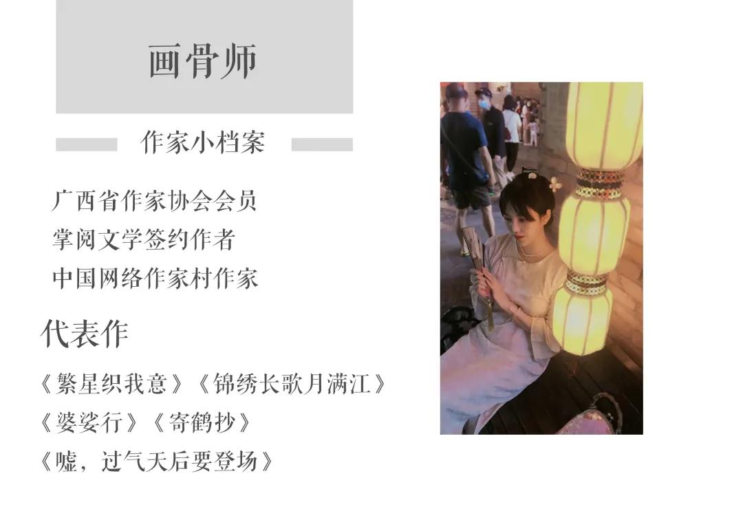 隨后,畫骨師2018年民國長篇小說《寄鶴抄》蟬聯第二屆掌閱文學創作大賽暨“俠世界”創世征文大賽,獲長篇一等獎;2020年中國數字閱讀云上大會上,現代言情小說《繁星織我意》(上)入選“2019年十佳數字閱讀作品”。畫骨師根據自己的創作節奏,不間斷地出版作品。目前,多部作品在影視化進行中。