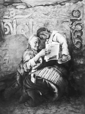 “從專業上來說,這幅畫題材不夠獨特,但這個畫面于我而言意義重大,我就想記下那個打動我的珍貴瞬間?!碑嬛?,一位老牧民手捧一本書瞇著眼睛細細端詳,孫女倚靠在旁好奇地看著,這位牧民正是格桑旺堆的妻子,而她手里的這本書就是《西藏最后的馱隊》。