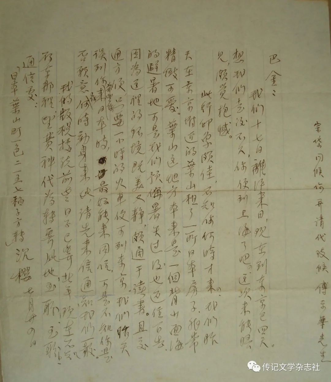 不到一個月后,他們又寫信:“我們真盼望你能早來?!边€托巴金帶火腿、辣醬和皮蛋;梁宗岱還有附筆:“沉櫻羅羅嗦嗦說了一大篇,想說的話都給她說完了,還有說不完的,希望你早日來再面談罷?!盵2]