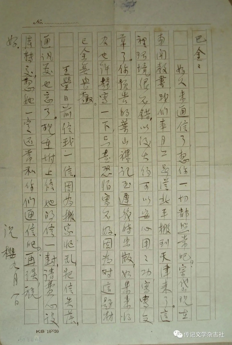 [1] 沉櫻1934年7月24日致巴金信,上海巴金文學研究會整理:《寫給巴金》,大象出版社2008年4月版,第126頁。
