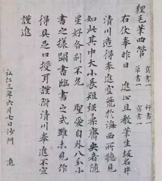 至唐代中期,根據書寫和字體需求,逐漸分化出不同的筆形。唐德宗貞元二十年(804)至憲宗元和元年(806)入唐求法的日本僧人空海曾將當時流行的唐筆及其制作工藝帶回日本,據此制成貍毛筆,并進奉給天皇。我們在空?!斗瞰I貍毛筆表》中看到筆分為四種類型,即真書筆、行書筆、草書筆和寫書筆,說明空海已經從大唐學得毛筆的制作技術(即簡毛之法、纏紙之要)和使用保存之法(即染墨藏用),除了上述四種筆之外,還有尚未仿制的八分筆、小書筆、踏書筆、臨書筆四種??蘸!斗瞰I貍毛筆表》記載以上多種毛筆類型,尤其是將不同筆形用于不同書體對應起來,表明唐代書家和筆工都已對筆形與書體之間的關系有了深入認知。