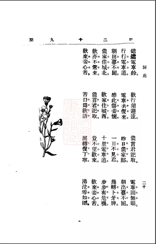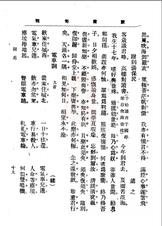 電氣車是上海都市中出現的現代事物?!陡裰滦聢蟆飞显浗榻B電氣車的速度,在平直之處,每分鐘能走七里。它的速度要遠遠快于馬車和人力車,但人們對電氣車的譴責之聲非常激烈。因為電氣車常常撞人,輕則受傷,重則身亡?!锻▽W報》上的《電車碾人》就登載過上海法租界電車在八仙橋西碾死王龔氏母子二人的消息。甚至有人估計,上海電車通行數月,“碾死者相望,夷傷者不可勝計”。這自然有些夸張,但電車撞人事件肯定引起了人們的擔憂?!陡倶I旬報》上刊載有兩首譴責電車的詩,分別是德爭的《哀電車》,和胡適(署名“蝶”)的《電車詞》。胡適的《電車詞》采用樂府體,以女子勸情郎少來見面的擔憂,突出電車的危險,“十里電車道,步步有危機”。德爭的《哀電車》則采用騷體,用眾多比喻極寫電車的速度之快,因而撞人也快,從而有些悲憤地譴責其無情。從美學風格來看,《電車詞》趨俗,《哀電車》近雅。但兩者在篇幅上都有一定的規模,不止四句、八句那樣短小。