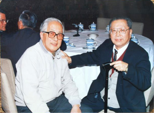 華君武(左)與曹禺 鄒士方 攝(1989年春節)