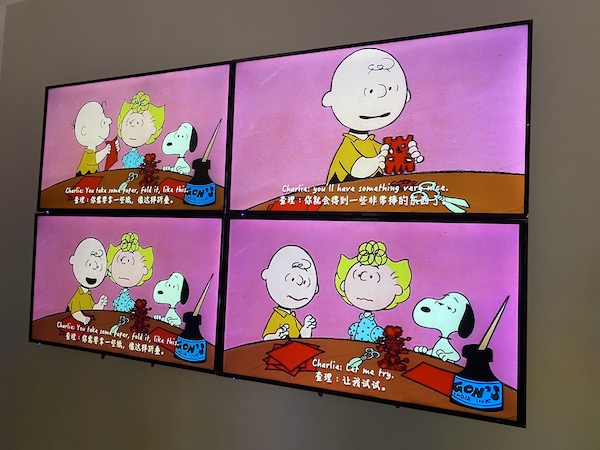 孫文倩表示,《花生漫畫》的成功在于它不僅是針對兒童讀者的產物,其創作背景正值“二戰”結束,美國社會飛速發展,國際社會關系兩極對立的“冷戰”時期。漫畫中體現出的對社會的洞察和反諷令人心生共鳴。在展覽中,鄔建安的作品《我是第一只登月的比格犬》便與時代背景相關,在現實中,史努比的確登上過阿波羅10號宇宙飛船,而漫畫中也曾講述史努比登月的故事。在這件作品中,藝術家以裝置還原了漫畫場景:身處“登月艙”的史努比上方,幾行彩色的字幕寫道,“我是第一只登月的比格犬。我打敗了俄羅斯人?!甭嬕源擞成淞水敃r的國際關系,而在今天,藝術家的重新演繹卻仍然應景。而在這件作品所在房間的外側,四塊屏幕重現了動畫片中有關露西的場景。孫文倩指出,《花生漫畫》的作者查爾斯·舒爾茨在他的時代是前衛的,“因為早在20世紀60年代,他就塑造了一些具有女性主義痕跡的角色;此外,他在1968年時就將一個黑人小孩的角色引入漫畫?!敝档靡惶岬氖?,這個角色的創造的確不是出于偶然:1968年,黑人運動領袖馬丁·路德·金遇刺身亡,不久后,一位女教師寫信給舒爾茨,呼吁通過漫畫的力量來喚起社會的平等。這個名為富蘭克林的兒童角色便是舒爾茨的回應。