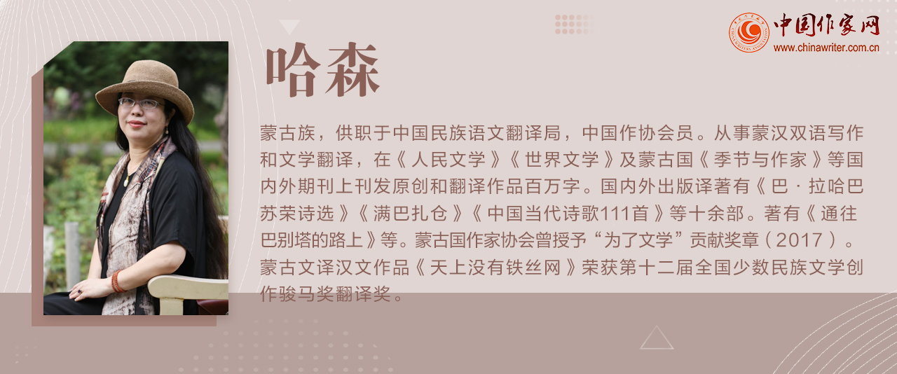 我十五年如一日地進行文學翻譯,自始至終,全然是因為心靈的召喚,因為熱愛蒙古文化,熱愛我所選擇的文本。希望通過我的翻譯,讓更多的人們更深刻地了解草原上的一切,從而抵達各美其美,美美與共的大好境地。我選擇翻譯為事業,此生無悔。