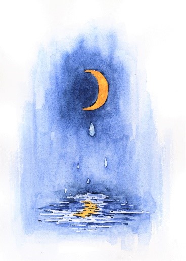 沒有交流的創作是沒有靈魂的。編輯、作者和我建立了一個交流群組,它有一個好聽的名字——自然郵遞員。我每創作一幅插圖之前都會畫草圖供大家討論。這個步驟對一個新手很重要。比如“月亮”這一篇,“你要是渴了,就坐在屋頂,順便端上一個小碗。月亮水汪汪的,一定能滴下水來?!钡谝话娌輬D,我畫端著碗的小豬坐在房頂上發呆,碗中映著月亮的倒影。編輯們給我的建議是——描繪“月亮滴水”的場景,能表現出“看上去像假的,其實是真的”的哲思,同時又富有意境。相比之下,之前的表現方式未免過于真實,少了些意境和美感。是的,這本書除了具象的“超級田野”,還是抽象的、哲學的。通過討論、修改“月亮”的畫稿,繪制的風格和方向突然明朗了。