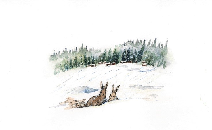 畫中還有兩個我必須提到的意象。第一個是 “提水站”,東北田地里最常見的小型建筑。東北的春天雨水不多,在田地里建個提水站為了方便灌溉。這種實用的小建筑通常是紅紅的房頂、白白的墻體。當田野慢慢變綠,一排一排的“紅房頂”無疑是春天里最亮眼的顏色。有一幅畫中出現了“紅房頂”,細心的讀者一定能發現。另一個是“冬天”。任何地方的冬天都取代不了東北的冬天。作為東北人,對冬天的情感是熟悉且自豪,寒冷又溫暖。其中的“霧天”是我個人最喜歡的一幅。野兔兄弟出逃,在霧天走丟。當霧終于散開,緊張又向往的心情浮現在兩只野兔的臉上——它們的背后是陌生的村莊,雪地很涼,村莊很暖,村莊后是一大片茂密的松樹。幾年前的初冬,我去過大興安嶺,置身松林的體驗為我創作這幅畫提供了很多靈感。當時我穿越大興安嶺,茂密的松林向后移動,車窗外的雪花簌簌地往后飛。降雪讓地面變滑,松林被風吹得嘩嘩響,令我緊張又向往。