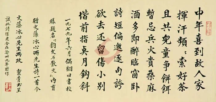 1979年夏天,老舍夫人胡絜青在家翻揀整理老舍留下的書籍手稿,在一部《韻文與散文》的校樣中,發現了一張老舍當年在重慶書贈冰心吳文藻的詩箋,睹物思人,胡絜青立即工工整整地把這首詩書寫成橫幅,裝裱后送給老友冰心。老舍的詩中這樣寫道: