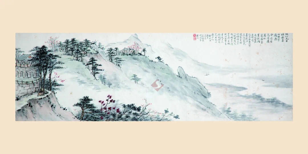 自1938年離開燕京大學南下,到1951年從日本回國,冰心一家的生活一直處在不穩定的狀態中。云南呈貢的默廬和重慶歌樂山的潛廬都給冰心留下了難忘的回憶?!陡铇飞綀D》展現的就是潛廬的風景。作者蔡叔慎是杭州浣紗人,抗戰時期也客居重慶,曾介紹同鄉晚輩壽崇德拜訪時居重慶金剛坡下的傅抱石夫婦。1945年8月抗戰勝利,蔡叔慎于除夕作此畫贈送冰心共賞,力圖使“江山重現秀色”展現于尺幅。作者在畫上題曰:“冰心先生住歌樂山林家廟自命所居為潛廬,萬松蔭蔽蒼翠欲滴,兔兒山巖石崢嶸兀立于右,遙望嘉陵江若隱若現風景至佳……”雖作者自愧“筆弱墨滯”未能使江山秀色盡現于尺幅間。但冰心很喜歡這張寫生于“八塊田 ”上的作品,她也始終把畫作放在身邊。