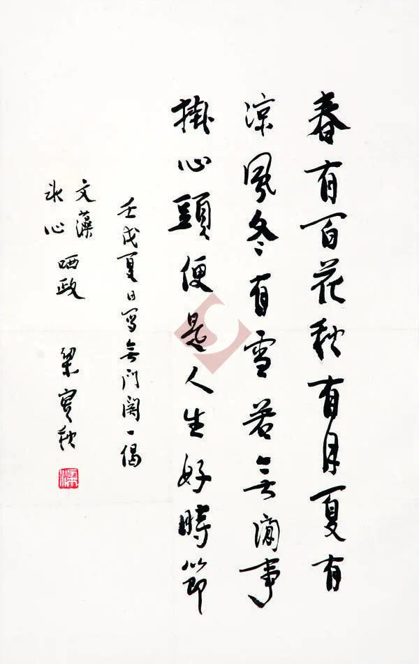 1982年夏天,遠在美國的梁實秋曾手書《無門關》中“春有百花秋有月”一偈,托從國內到美國去探親的大女兒梁文茜帶回國內,代他贈與幾十年未見面的老朋友吳文藻和冰心。詩云: