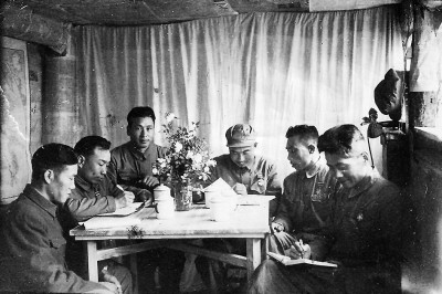 1952年5月,李蕤在188師指揮部坑道中采訪。右起:李蕤、188師師長張英輝、副政委陳英、政治部主任棄里三、政委李真、副師長徐成功。