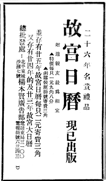 其實,代售《故宮日歷》的楊本賢廣告公司,在中國廣告史上也是大名鼎鼎,這是1921年創辦的北京首家廣告社,其主要業務是為在京各報承攬廣告業務,后來發展到兼營電臺和影院廣告,其經營規模與專業程度在當時的中國廣告業內是有口皆碑的?!豆蕦m日歷》由楊本賢廣告公司代售,從一開始就顯示出“強強聯手”的意味;其營銷推廣的力度與專業度,明顯要優于本地與外地的代售商家。