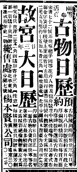“故宮大日歷,厚銅版紙精印活頁,一面日歷,一面古物(古畫內郎世寧等名畫家作品最多),較前兩年出品尤為精彩絕倫,饋贈親友尤為相宜。每只售洋二元二角,函購加寄費三角?!咀⒁狻棵抠徣諝v五只,加贈《梅蘭芳劇影》一冊,購十只加贈《富連成卅年史》一冊。經售處:北平東城沙灘七號楊本賢廣告公司?!?/span>