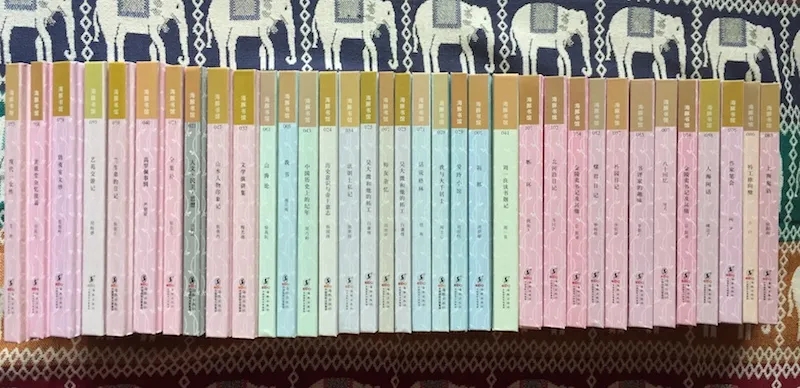 另一種與南大社瘦版小精裝一樣,對本土小開文化有創新和發展,我個人持正面評價的變體小精裝文庫,是“海豚書館”。這個文庫也是沈公退休后,與俞曉群、陸灝“談情說愛”、搞事情的成果。十年前,俞曉群從遼版集團老總的位上榮退,轉戰京城,受聘于海豚社,遂成了這個項目的實操者。此文庫“致力于文化普及的長遠出版工程”,按內容,分成六種顏色,分別為藍系(海外文學)、紅系(文學拾遺)、橙系(文學原創)、綠系(學術鉤沉)、灰系(學術原創)和紫系(翻譯小品)。一般來說,學術出版不碰文學原創,是通例,可“豚館”卻連原創帶翻譯,與學術“一勺燴”,給人的感覺是野心好大。不過,俞總出手,必是大手筆,早已是業界共識,我當然也不懷疑。反正他們一邊出,我一邊收就是。統共除了多少種,包括何時被打上了休止符,我都不大清楚。自己手里各種色系,計有三十五種,且頗有幾種難得的資料。
