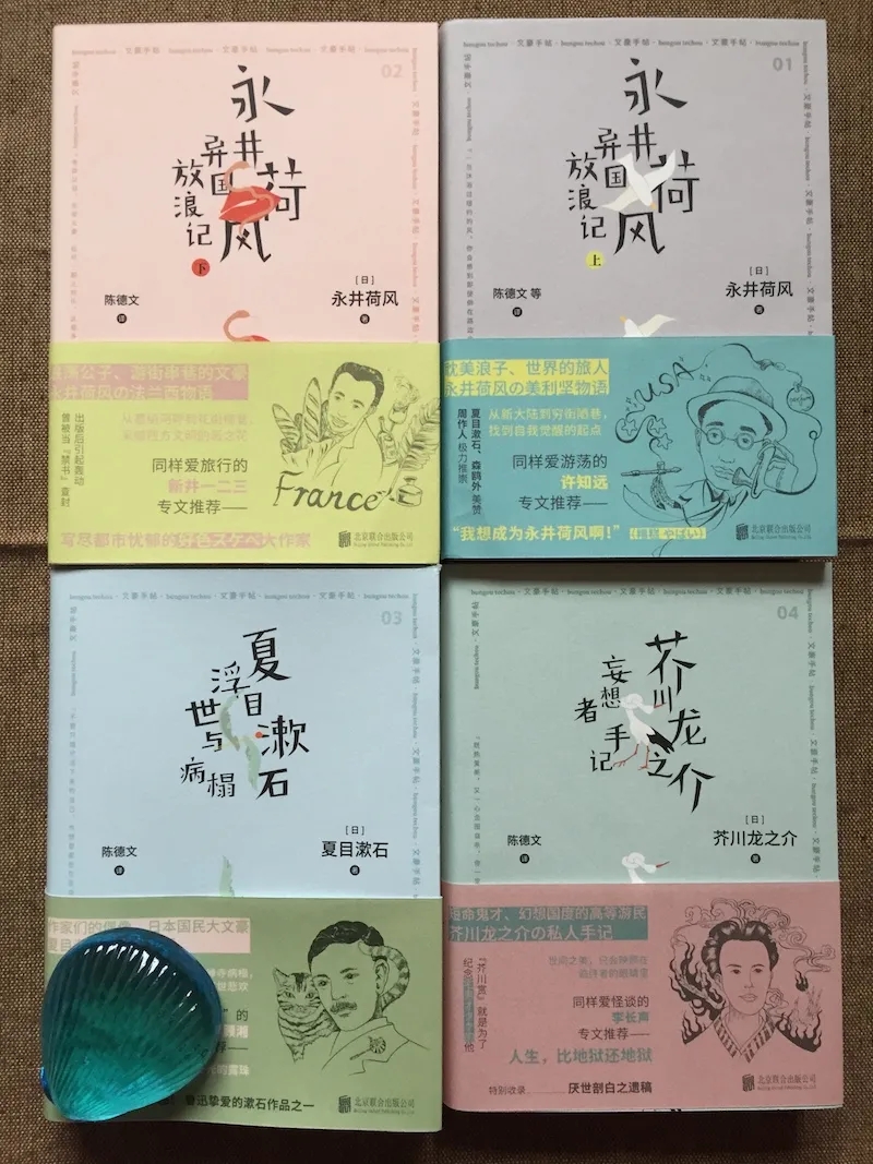 另一家我想到的蠻有日系文庫范兒的出版機構,是剛起步未久的一頁(folio)。這家社新近出品的“文豪手帖”叢書(全四種),分別為永井荷風的《美利堅物語》和《法蘭西物語》,夏目漱石的《浮世與病榻》及芥川龍之介的《妄想者手記》(四種均為陳德文譯,北京聯合出版公司2020年7月版),文庫版開本自不在話下,從封面到書衣,從和風環襯到編號等要素,真與角川文庫的純文學系有得一比。盈握在手的瞬間,人就被治愈了。
