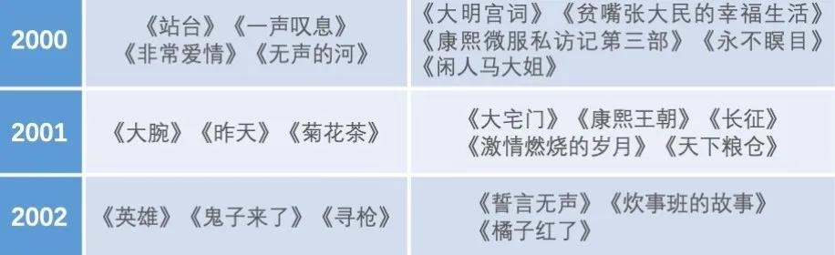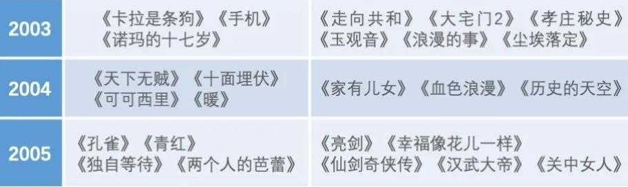 在明確中國現代Ⅱ第二波具有流動回溯的現代性這一特質以及影視藝術在人生情境體驗營造上的美學特長的交叉點上,可以更清晰地觀察21世紀初中國影視潮的狀況。從下列表格的簡要列舉,可以對這二十年中國影視潮中的部分作品作一次匆匆瀏覽: