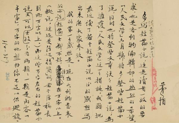 茅盾這封信,我們這輩人也應該是非常熟悉的,只要涉及到當代文學研究,這封信是繞不過去的。一是這篇文章繞不過去,二是文章里面提到的那些作品,很多已經成為了當代文學的經典之作,也是繞不過去的?!墩勛罱亩唐≌f》這篇文章完稿日期是1958年5月12日,是應《人民文學》編輯部的邀請寫的,茅盾也寫過很多短篇小說,他也是很樂意評論的。 我們對作家進行研究,非常重要的一點,就是他的文本研究,特別是在今天來講是越來越重視了。近現代的版本,我個人認為遠遠比古籍復雜,這里面的版本變化各種各樣,有作者自己的反復修改,像老舍的《駱駝祥子》等不知道出過多少版本,也有當時的情況下比如說被鎮壓的,被銷毀的,被查禁的,還有政治形勢下需要進行某種修改,所以非常復雜,出現了很多版本。我也希望對以后文學的研究,加強對文本的研究。