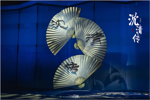 據本劇的總編導之一柯書劍介紹,在舞蹈設計編排上,巨幅折扇的運用,是作為環境移變與劇情轉折的提示點和強化點。那么,折扇不僅僅是演員手中的一個道具,更是融入到劇情當中的一個重要角色,承擔起了強化舞臺空間與劇情演變的功能。比如,當寫有“祭” 字的折扇出現時,提示進入沈清要在祭祀儀式中被投入海中的重要情節,瞬間調動觀眾情緒,扣人心弦。