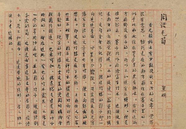 41篇文稿有的用深綠色和淡綠色稿紙,有的用紅色普通格子紙或榮寶齋稿紙書寫,字跡工整美觀,鮮有修改痕跡,周作人本人的說明不多,編輯的加工和批注更少。這些手稿據考證,為周作人在1960年至1965年之間投稿給香港《新晚報》的手稿,為《新晚報》創始人羅孚多年間的珍藏。